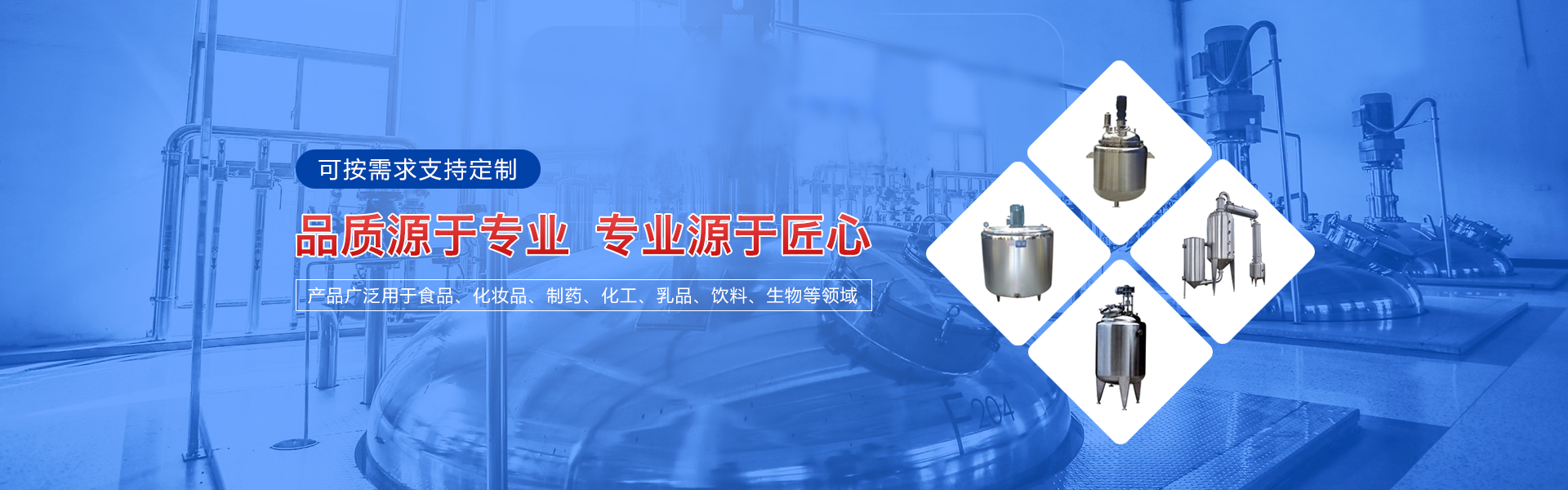 主要經營各種機械設備的制造、加工、銷售,主要產品有攪拌罐、冷熱缸、發(fā)酵缸、乳化罐、貯罐、移動罐、夾層鍋、調配罐、脫氣罐、方槽、電加熱調配罐等各種食品機械和制藥機械。產品廣泛被用于食品、化妝品、制藥、化工、乳品、飲料、生物等領域,深受新老客戶的信賴與好評。
